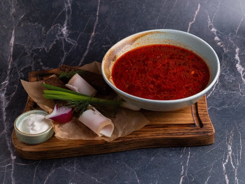 Классический борщ из говядины. Подается со сметаной, с салом и бородинским хлебом.
