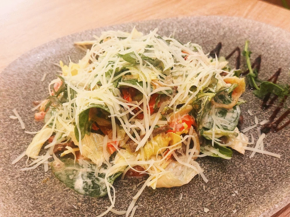 Нежная телятина, салатный микс, сыр пармезан, черри, йогуртовая заправка, бальзамический соус