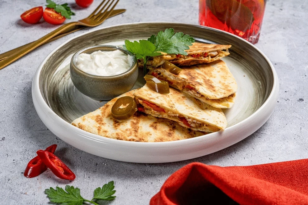 Пшеничная тортилья, курица, лук, фасоль, перец болгарский, сыр моцарелла, сметана, соус гуакамоле, перец халапеньо