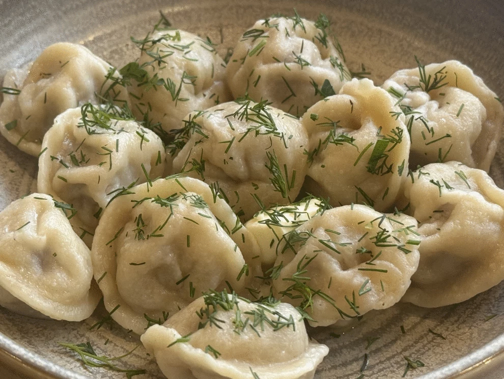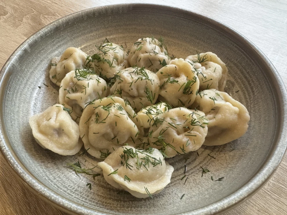 Домашний фарш из свинины и телятины, специи, чеснок, зелень, масло сливочное На выбор: с бульоном или без. Порция 12шт.