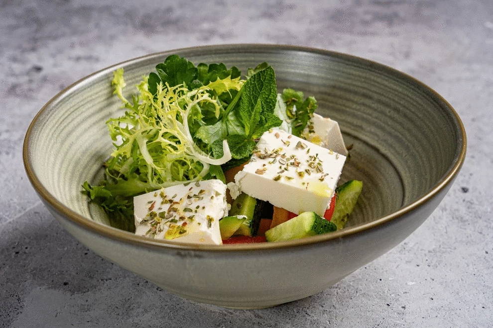 Салатный микс, огурцы, помидоры, брынза, оливковое масло и тыквенные семечки