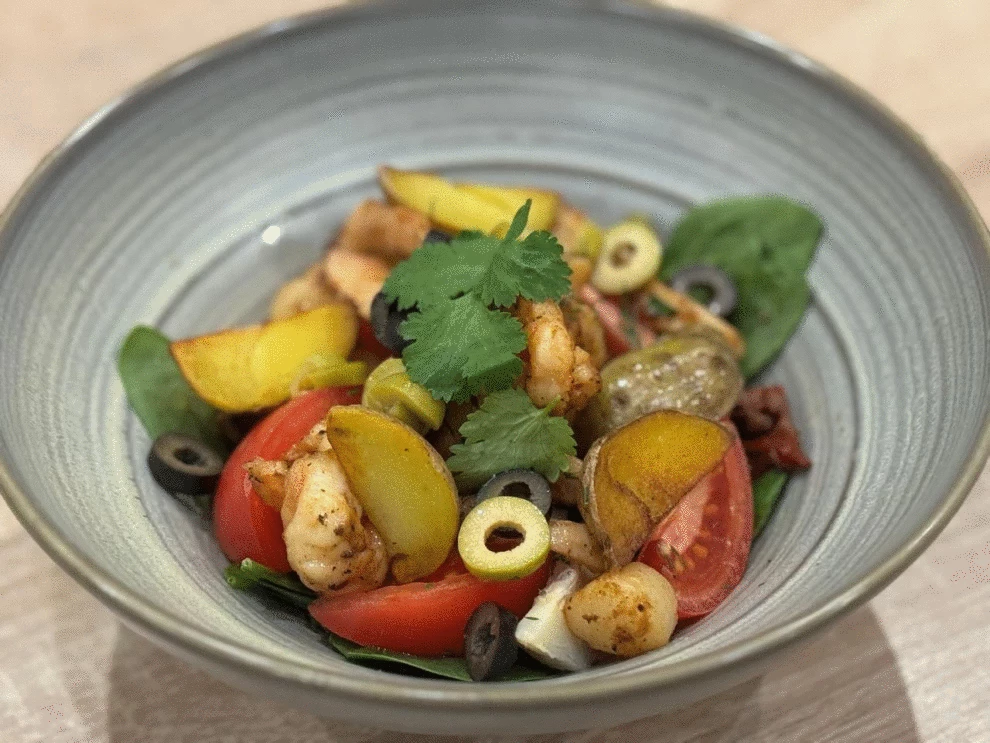 Обжаренные креветки, кальмары, гребешки с маринованными артишоками, картофелем черри, вялеными томатами, листьями шпината, помидорами и соусом цитронет