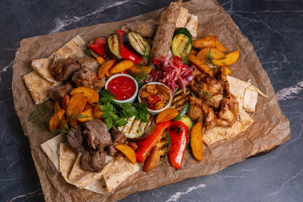 Шашлык из курицы, свинины, люля кебаб из телятины, картофель фри, овощи гриль маринованный лук, соус