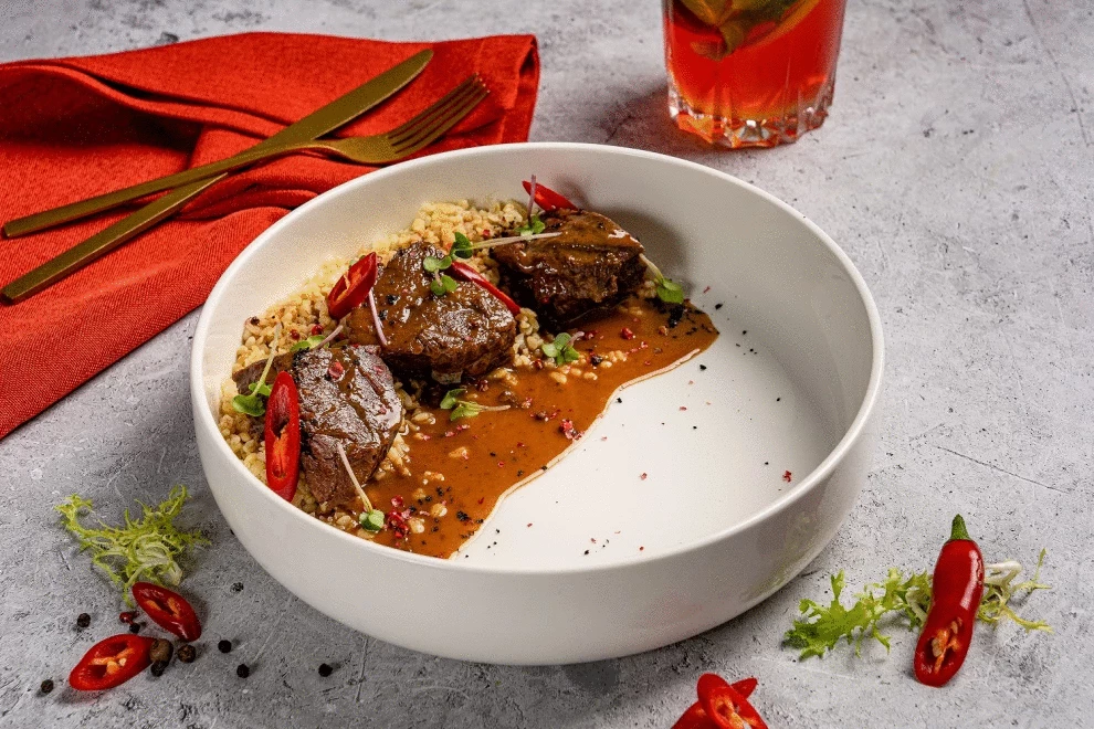 Телячьи щечки с соусом ред вайн, гарнир на выбор: дуэт из дикого и белого риса, картофельное пюре